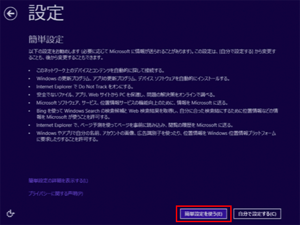 簡単設定を選択すると、更新プログラムの自動インストールやPCの保護、PC のアカウント情報に基づく個別コンテンツのインストールなどの設定を自動で行うことができます。クリックした後に、手順9 にお進みください。