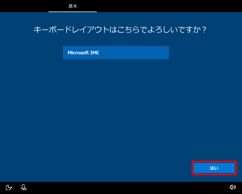 3. [キーボードレイアウトはこちらでよろしいですか?] 画面で 、[Microsoft IME] を選択して、[はい] をクリックします。
