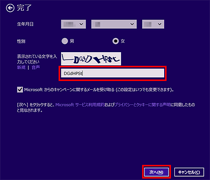 Microsoft からのキャンペーンに関するメールを受け取らない場合はチェックボックスのチェックをはずします。