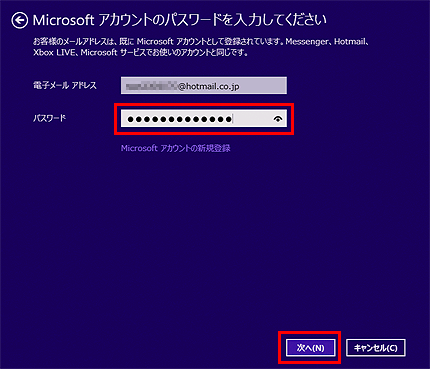 b.【Microsoft アカウントのパスワードを入力してください】が表示されたら、【パスワード】欄にMicrosoft アカウントのパスワードを入力し、【次へ】をクリックします。