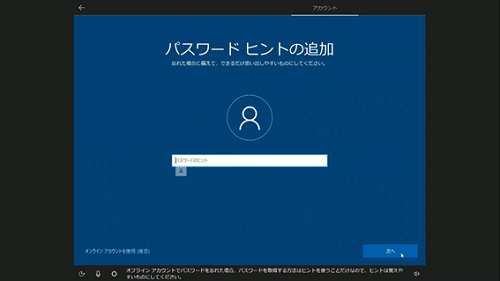 この画面で、パスワードの設定は必須ではありません。Windows起動後も設定や変更ができます。