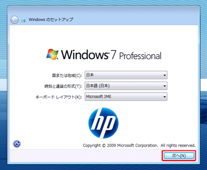 [国または地域(C)] が 「日本」 、 [時刻と通貨の形式(T)] が 「日本語(日本)」 であることを確認し[次へ(N)] ボタンをクリックします。