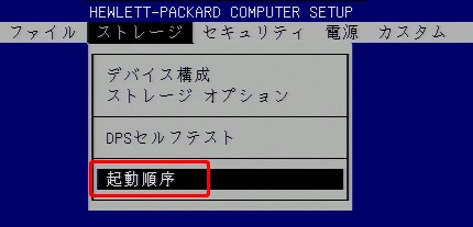 3.続いて、ブートの順序でHDDをUSBメモリより前に移動します。BIOS セットアップユーティリティを起動します。[ストレージ] メニューより [起動順序] を選択し、[Enter] キーを押します。