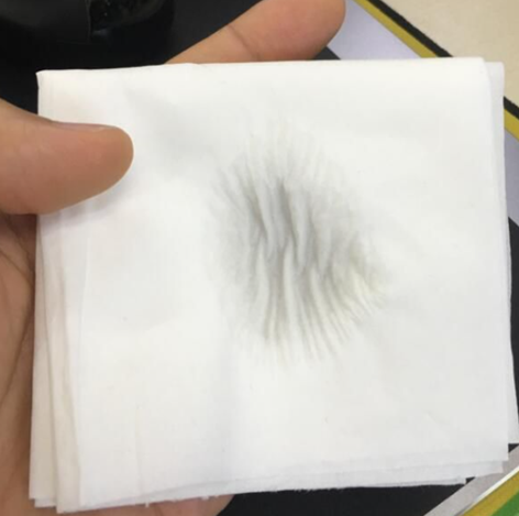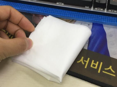 도장 찍듯이 꾹꾹 누르는 작업은 청소효과를 위해 여러번 반복할 수 있지만 장시간 동안 누르고 있는 상태를 유지하거나 앞 뒤로 마찰하듯이 비비면 안됩니다. 잉크가 휴지에 선명하게 보일 때 까지 작업을 반복합니다 .