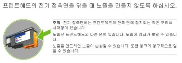 참고: 이미 전 단계에서 설명했던 내용처럼 프린트 헤드의 노즐 표면은 손가락, 휴지, 헝겁등으로 문지르거나 닦으면 손상될 수 있기에 노즐은 피해서 닦습니다.