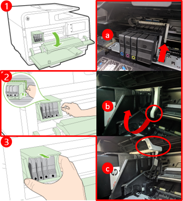 3) 카트리지 엑세스 덮개를 열고 프린트 헤드와 잉크 카트리지를 분리합니다.