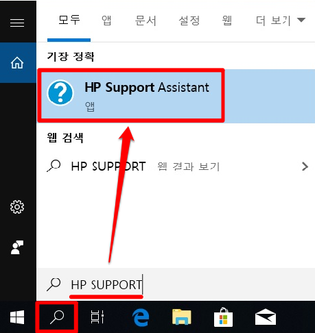 1. 검색 버튼을 선택하고 [HP Support]항목을 선택하고 결과에 [HP Support Assistant]항목을 선택하여 실행합니다.