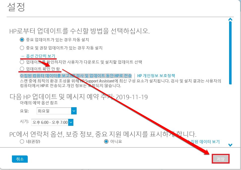 HP 서포트 어시턴트에서 강제로 자동으로 드라이버 업데이트 하는 기능을 비활성화 시키고 싶어요.