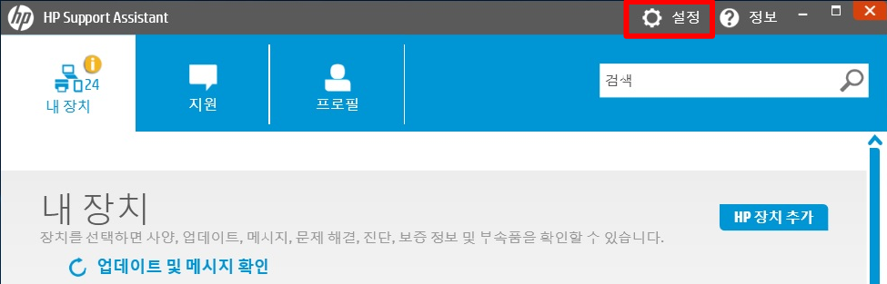 2. HP Support Assistant 창에 오른쪽 하단에 [설정]항목을 선택합니다.