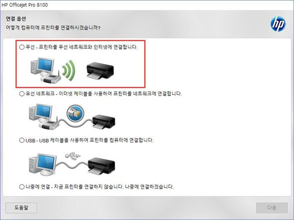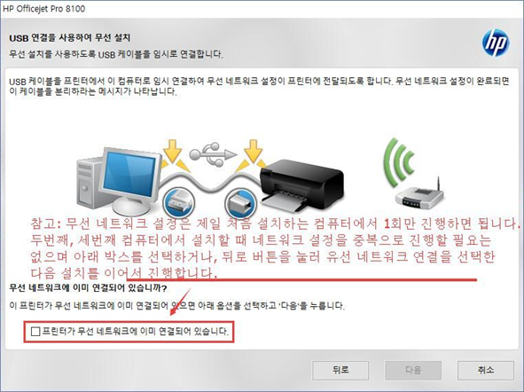 무선 네트워크 설정은 제일 처음 설치하는 컴퓨터에서 한번만 진행합니다. 모든 컴퓨터에서 무선 네트워크 설정을 반복할 필요가 없으며 아래 [프린터가 무선 네트워크에 이미 연결되어 있습니다]를 선택하거나, 뒤로 버튼을 눌러 유선 네트워크(유선 네트워크 가능한 모델만) 연결을 선택하고 다음 절차를 이어서 진행합니다.
