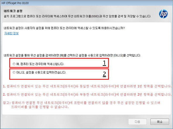 컴퓨터가 유선 네트워크에 연결되어 있거나, 또는 프린터를 컴퓨터와 다른 무선 네트워크에 연결해야 할 경우 [아니오, 설정을 수동으로 입력하겠습니다]을 선택합니다.