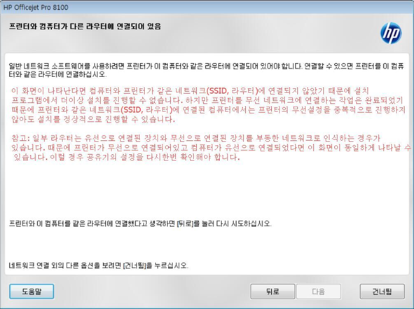 프린터와 컴퓨터가 같은 네트워크에 연결되지 않았다면 다음과 같은 화면이 나타날 수 있습니다.