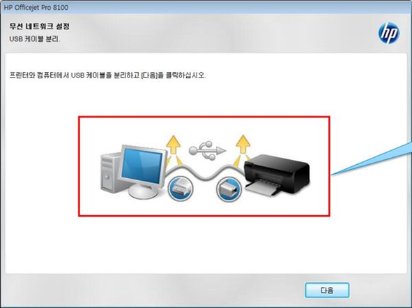 10. 다음 그림과 같이 연결 설정이 완료되면 USB선을 분리하고 다음을 누릅니다.
