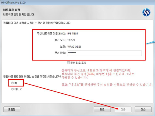 8. 컴퓨터의 무선 설정(SSID, 비밀번호)을 프린터에 그대로 적용할 수 있습니다.