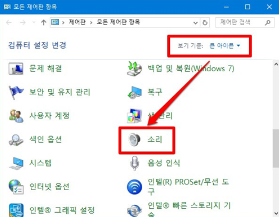 2. 제어판에 오른쪽 상단 보기 기준을 [큰 아이콘]으로 설정하고 항목 중 [소리]를 선택합니다.
