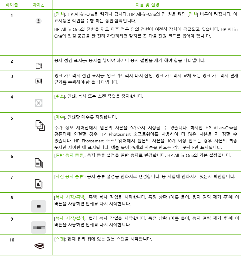 HP DeskJet F2180 제어판 램프 상태 및 오류 메세지