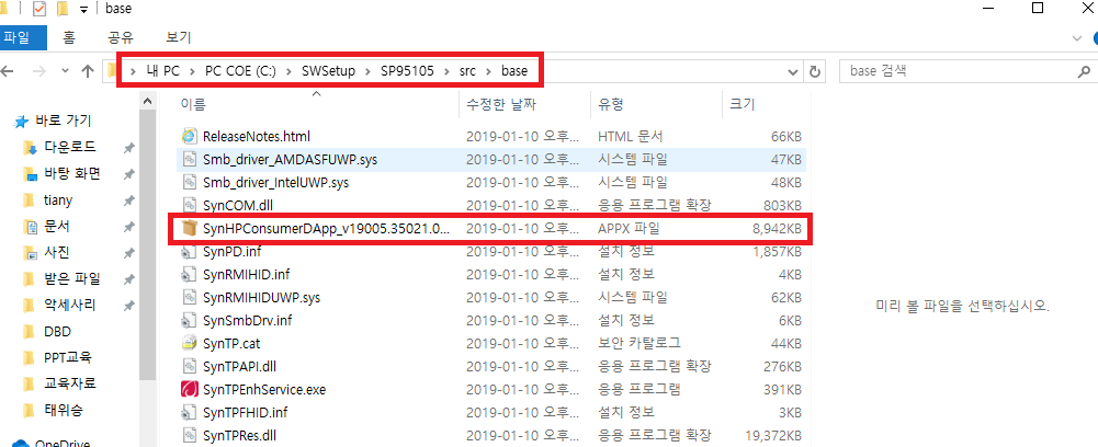 Synaptic터치패드 드라이버 설치 후 C:\SWSetup\SPxxxxx 경로에서 Appx 파일을 확인할 수 있으며 해당 파일을 실행하여 S ynaptics 터치패드 앱을 설치할 수 있습니다 .