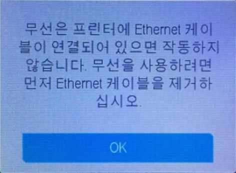 유선(이더넷) 무선 연결을 동시에 사용할 수 없기 때문에 무선 네트워크를 활성화하려면 유선 네트워크 케이블을 프린터에서 분리해야 합니다.