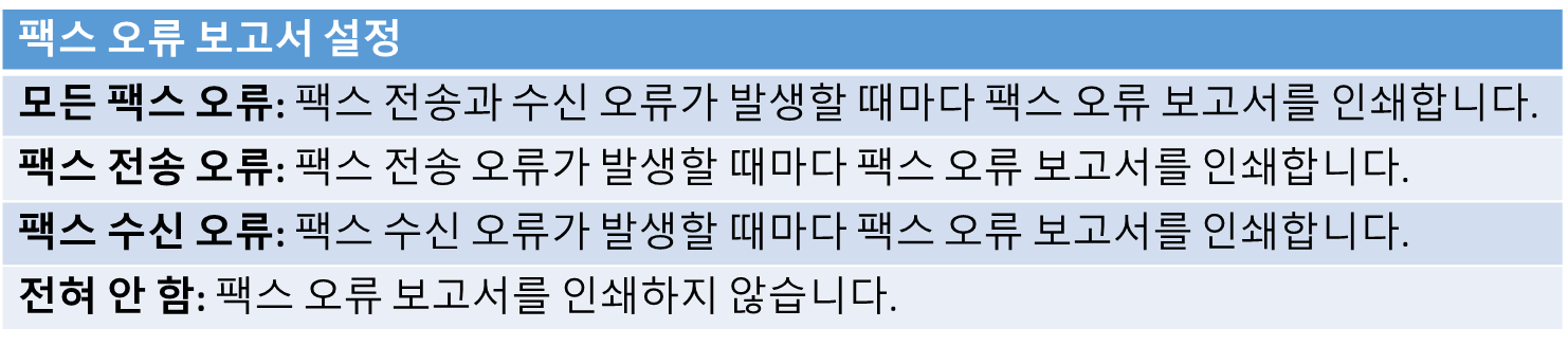 팩스 오류 보고서는 제품에서 발생한 팩스 작업 오류를 나타내는 간략한 보고서입니다. 팩스 오류 보고서의 인쇄 시기를 설정하려면 다음 절차를 따릅니다.