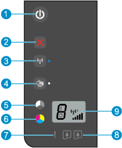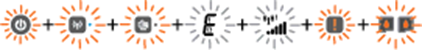 8. 전원 버튼 표시등, 무선 상태 표시등, 무선 다이렉트 상태 표시등, 문자 "E", 용지 오류 표시등, 무선 강도 표시등, 오류 표시등 및 두 카트리지 표시등이 깜박입니다.